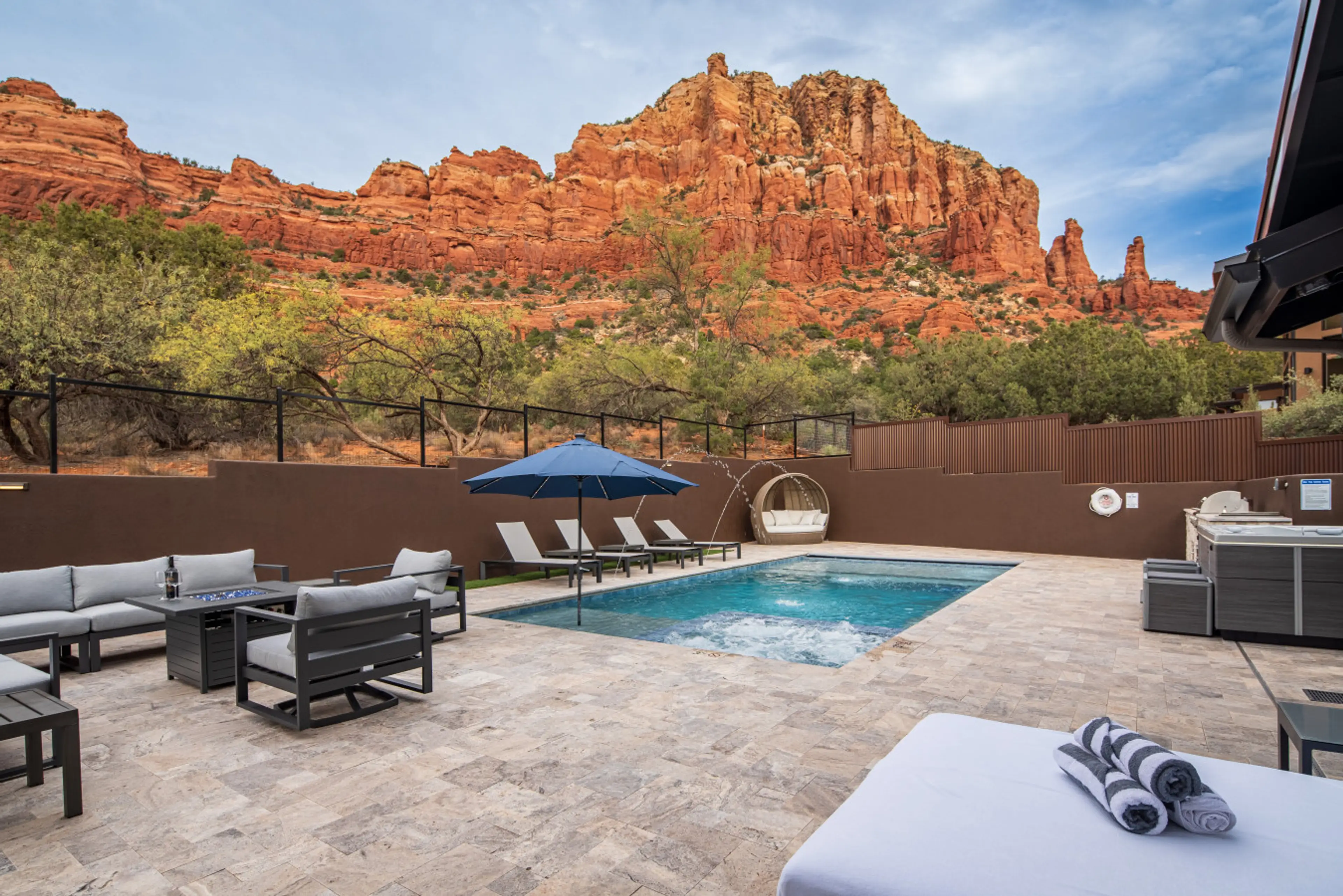 Sitting at the base of one of Sedona’s most historic mountains with hiking trails directly behind the residence, your own personal retreat with a pool and 2 spas. Multi-million dollar property fully remodeled in 2025. - Sleeps 12 | 4 bedrooms | 6 beds | 3 full baths - Fire pit, BBQ & outdoor din...